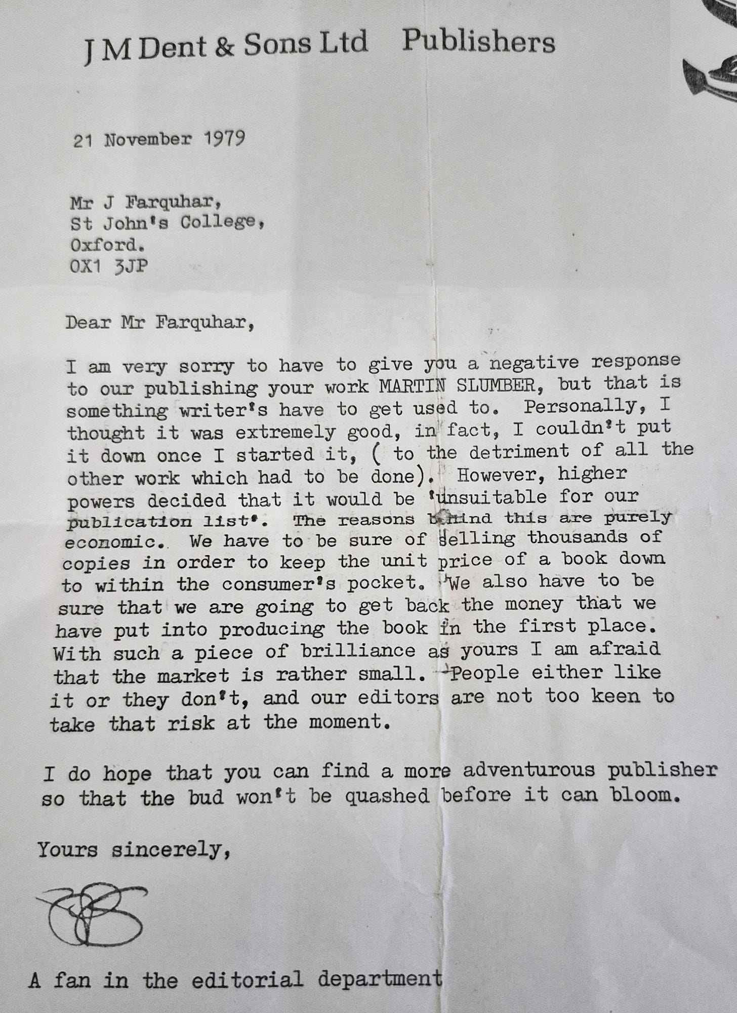 To that end, I have been interviewing John Farquhar, author of I Leant Upon a Copper Pipe – and he has just sent me this amazing rejection letter from November 1979, his very first. I will enclose both the original image, and the extracted text for people reading on their phones: